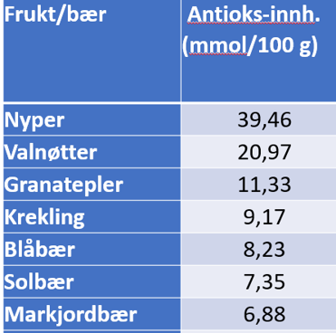 Her er 7 på topp-lista over matvarer med mye antioksidanter. I høst plukket jeg masse nyper, og aronia i nærområdet. Jeg bruker valnøtter på grøten og spiser granateple daglig! Enkelt forklart tror man at antioksidanter kan reparere celleskade og hindrer oksidasjon (at kroppen "ruster"). Det skjer daglig hos alle (sol, luft, aldring, miljø m.m.) Sjekk hele listen over antioksidantinnholdet i ulike matvarer som Rune Blomhoff og hans team har utarbeidet. Og husk at 100 gram nyper er mye vanskeligere å spise enn samme mengde blåbær. Nordmenns største kilde er faktisk kaffe. Ikke fordi innholdet av antioksidanter er høyt, men fordi vi drikker så mye kaffe! Under kreftbehandling skal man ikke ta tilskudd av antioksidanter, men i kosten kan man gjerne kjøre på! Det gjorde jeg til gangs.